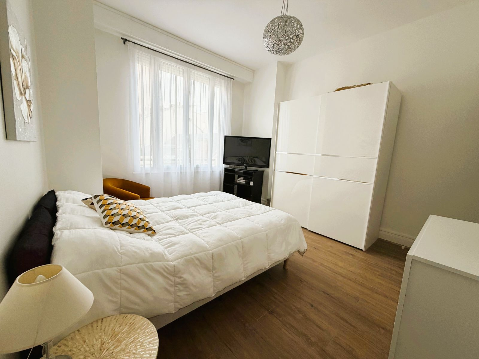 Entièrement rénové, il se compose d'une entrée (6 m²), salon/séjour (25 m²), cuisine équipée avec accès à un balcon, deux chambres (12,89 m² et 13,93 m²), salle d'eau (4 m²), wc indépendant.