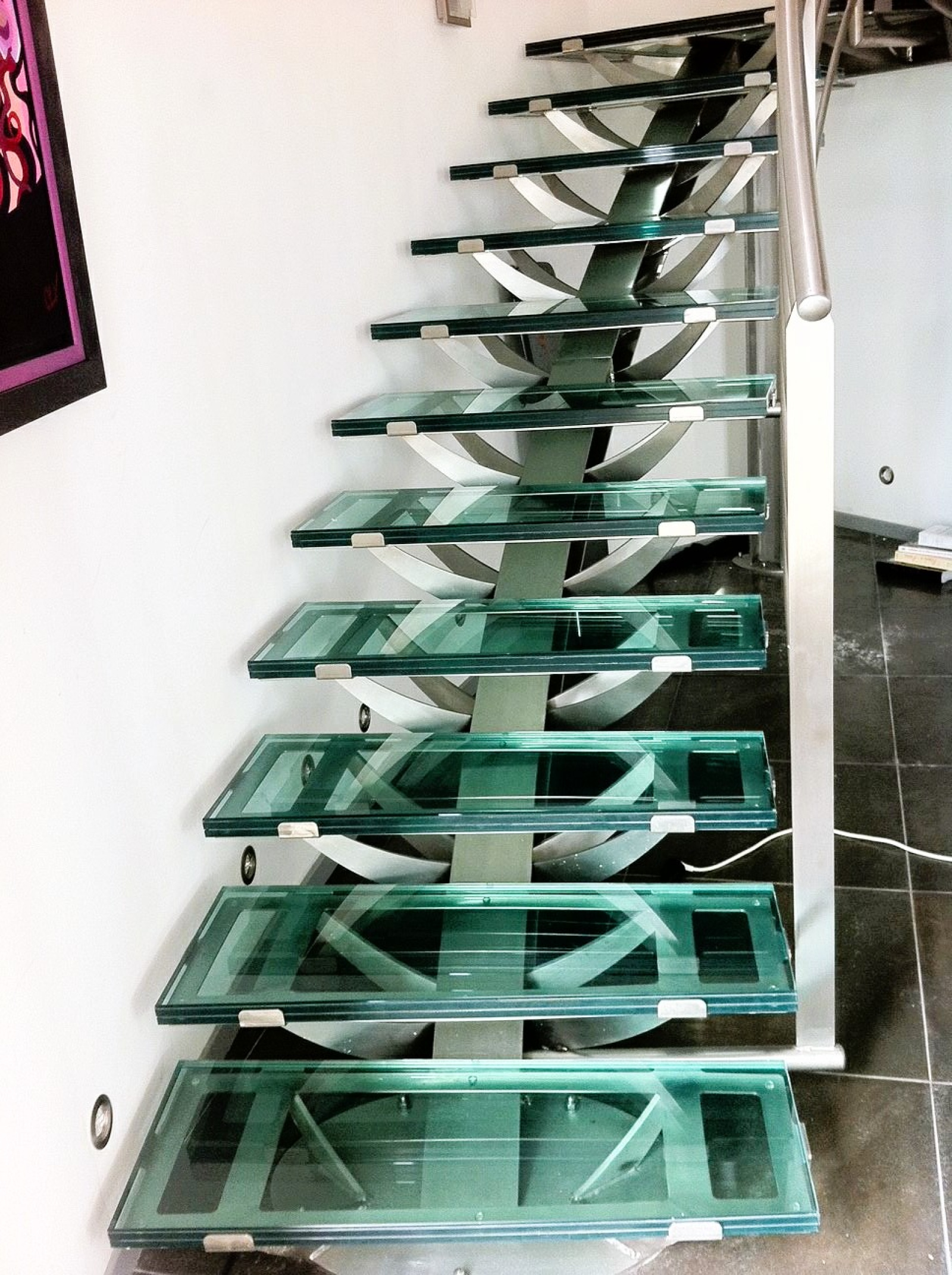 L'étage accessible par son escalier et ses marches en verre (véritable oeuvre d'art) comprend un dégagement, une suite parentale avec salle de bains et nombreux placards / dressing entièrement conçus sur mesure, deux chambres, salle d'eau avec wc.