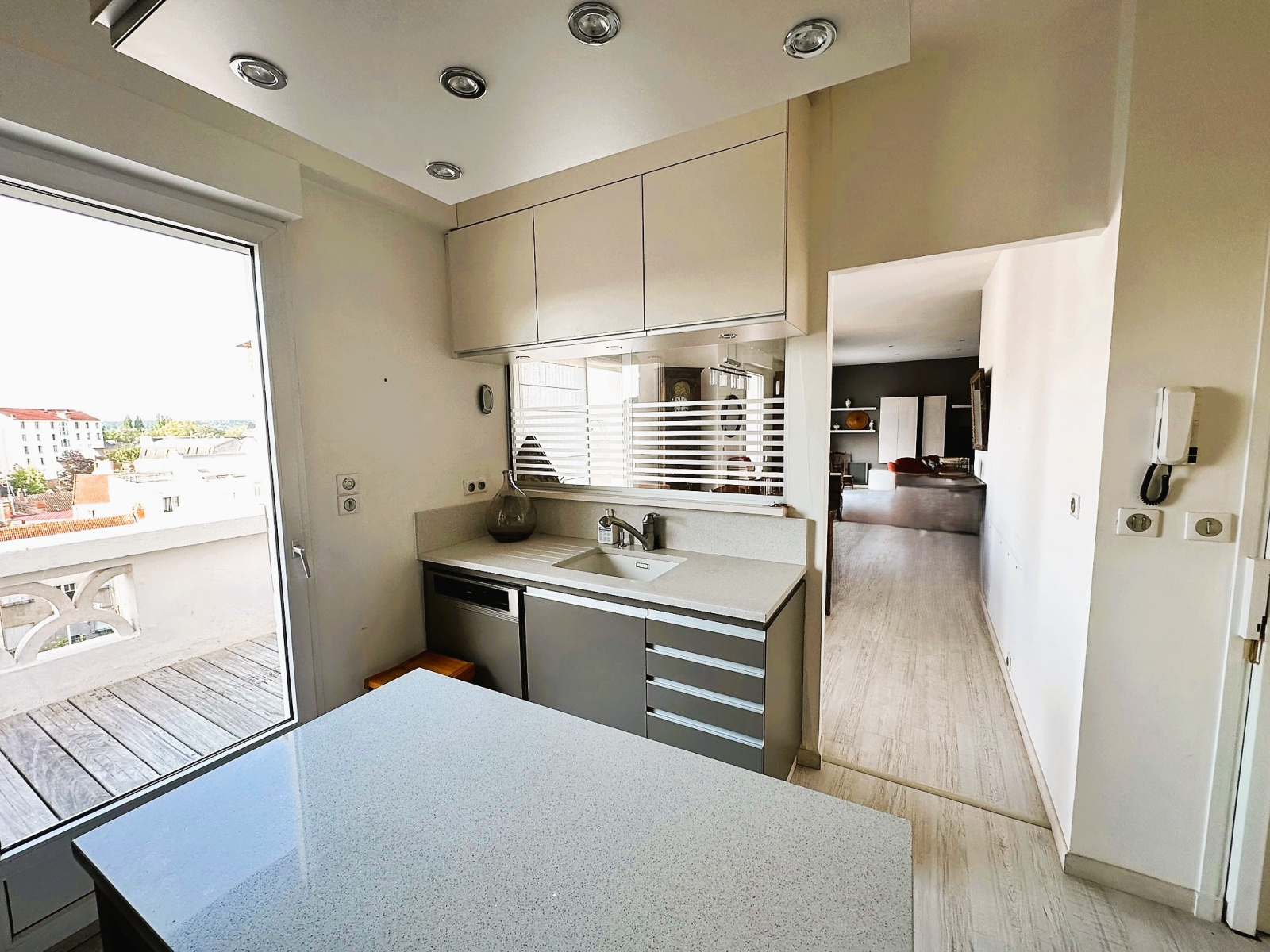 Seul à l'étage avec son emplacement privilégié, ses volumes généreux et sa luminosité, il se compose d'une vaste pièce de vie avec cuisine équipée semi-ouverte (56 m²), l'ensemble ouvrant sur une terrasse de 23 m² exposée plein sud, suite parentale avec dressing haut de gamme (24 m²), salle d'eau, wc indépendant, seconde chambre avec placards (13,65 m²), salle d'eau avec wc.