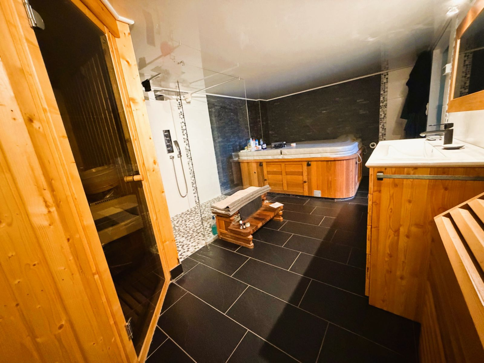 Rez-de-jardin: entrée avec nombreux placards, salon de réception (69,50m²) dévoilant la majesté des volumes anciens, hauteur sous plafond, décor muraux, parquet, cheminée, luminosité et accès au jardin (121 m²), cuisine équipée avec en contigu un cellier et une cave à vin, chambre (45 m²) avec une salle de bains attenante et une salle d'eau (espace spa avec sauna et jaccuzzi), salon télé, bibliothèque, bureau ou chambre, toilette, studio indépendant de 23 m².