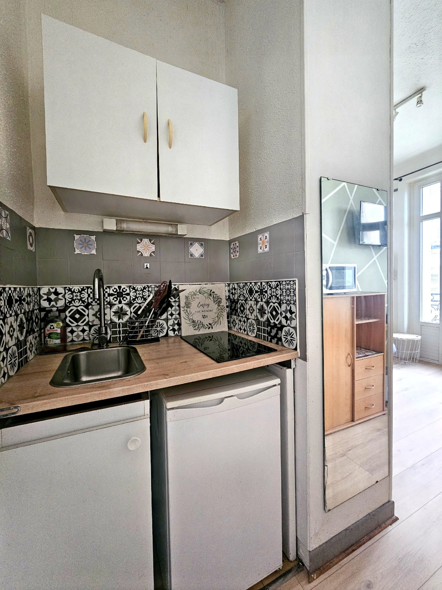 Il se compose d'une entrée avec kitchenette, une pièce de vie donnant un accès exterieur avec balcon (vue dégagée), et une salle d'eau avec WC.