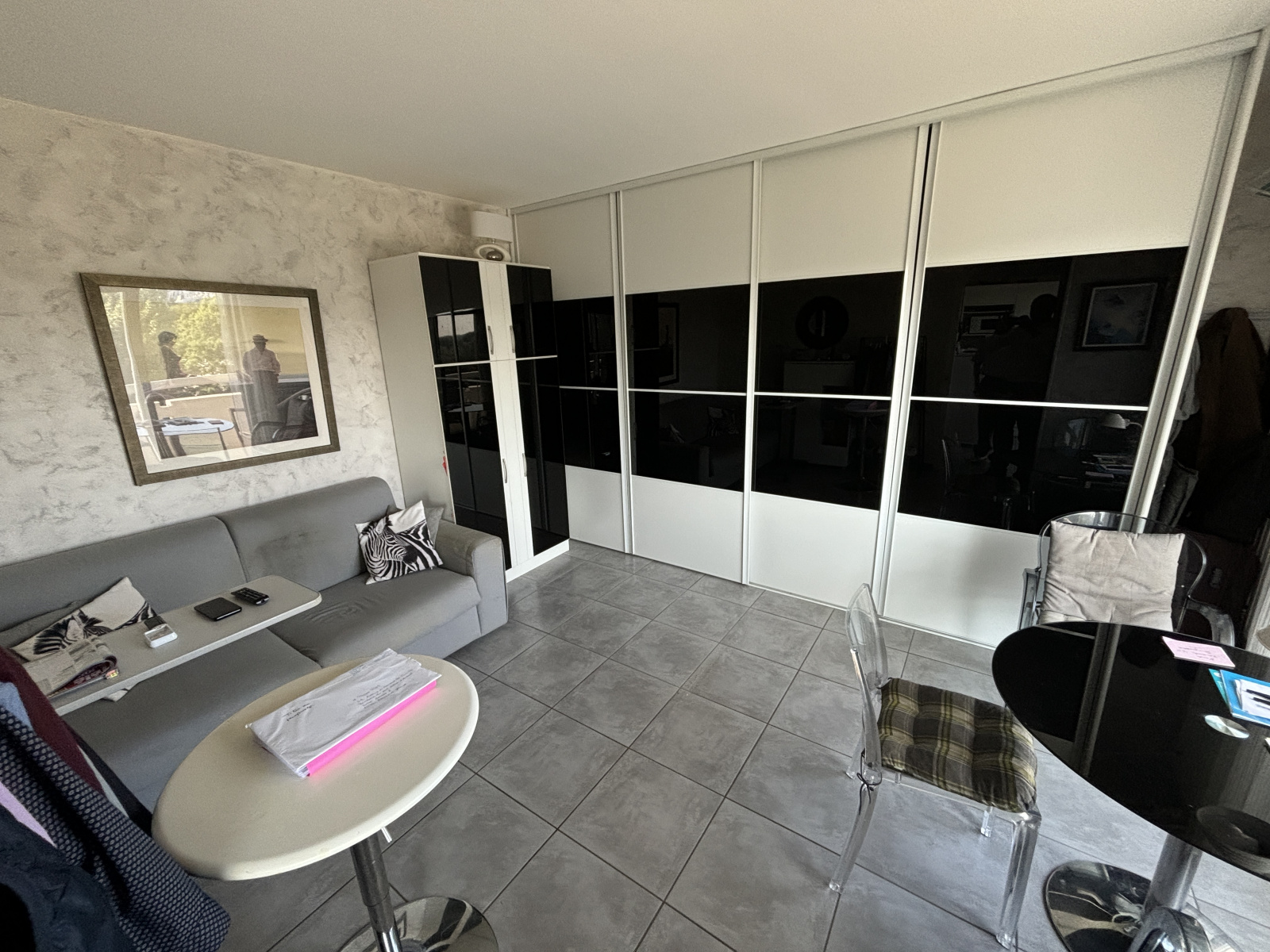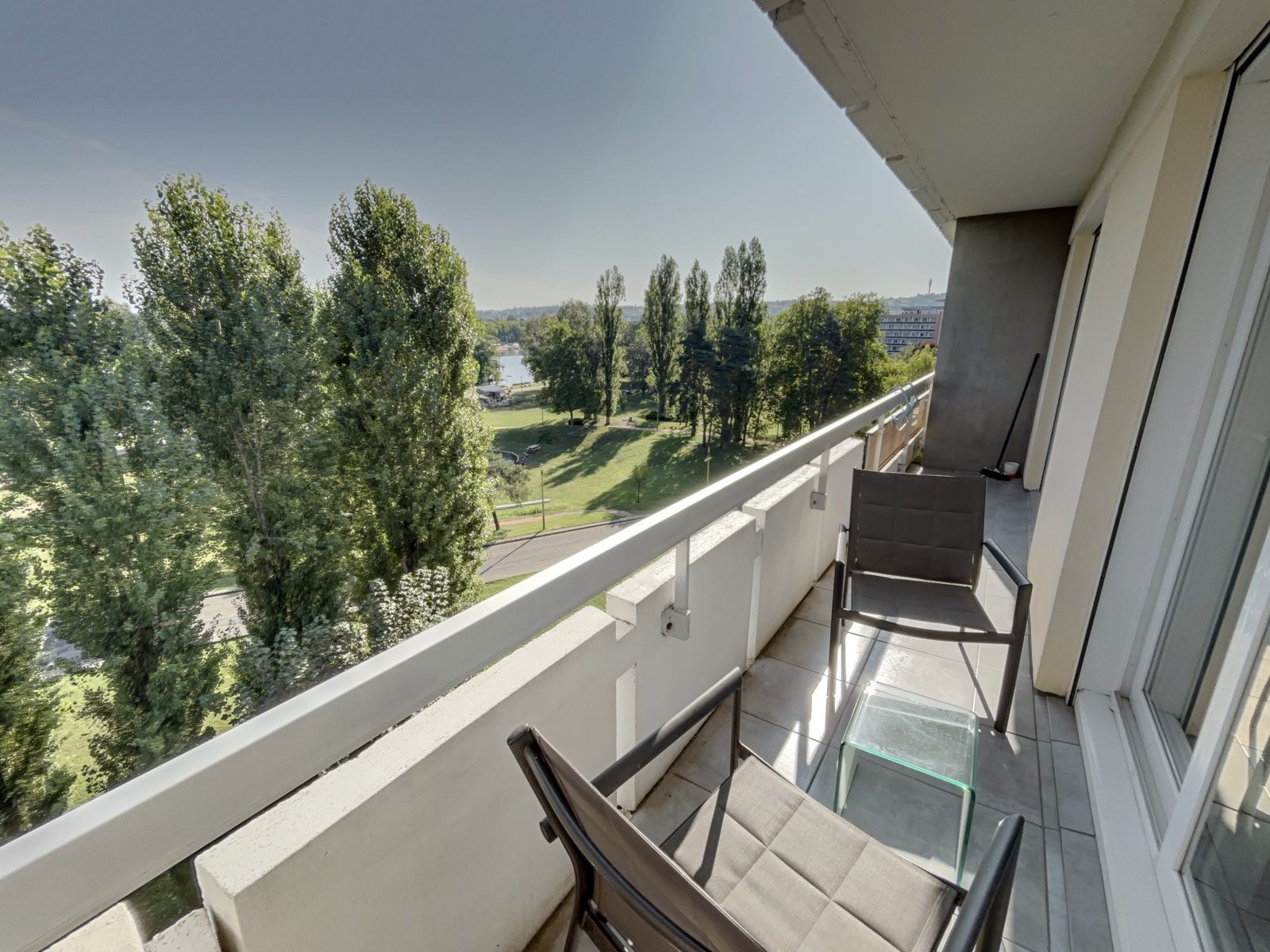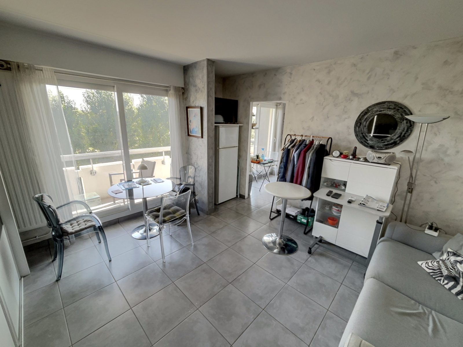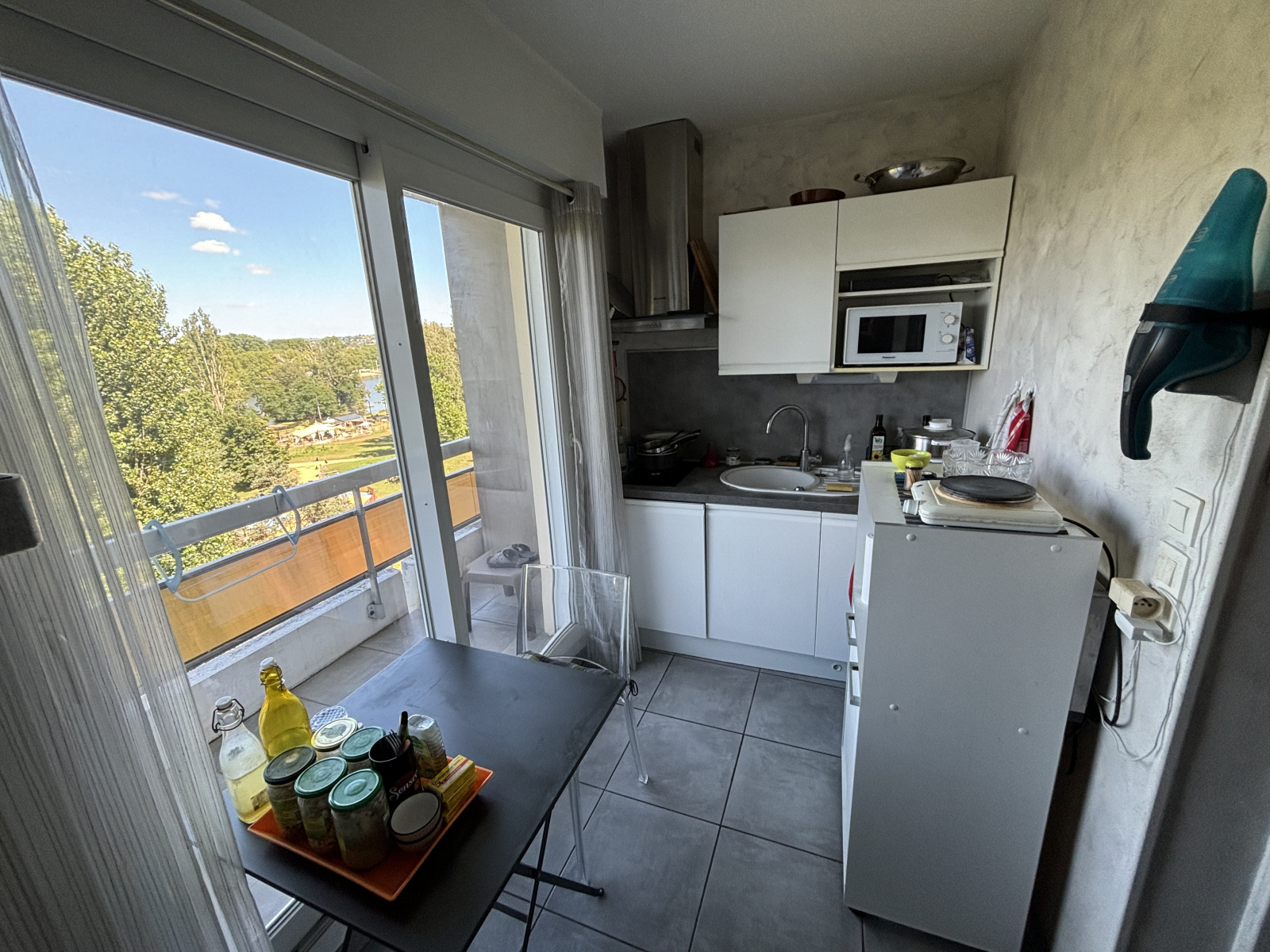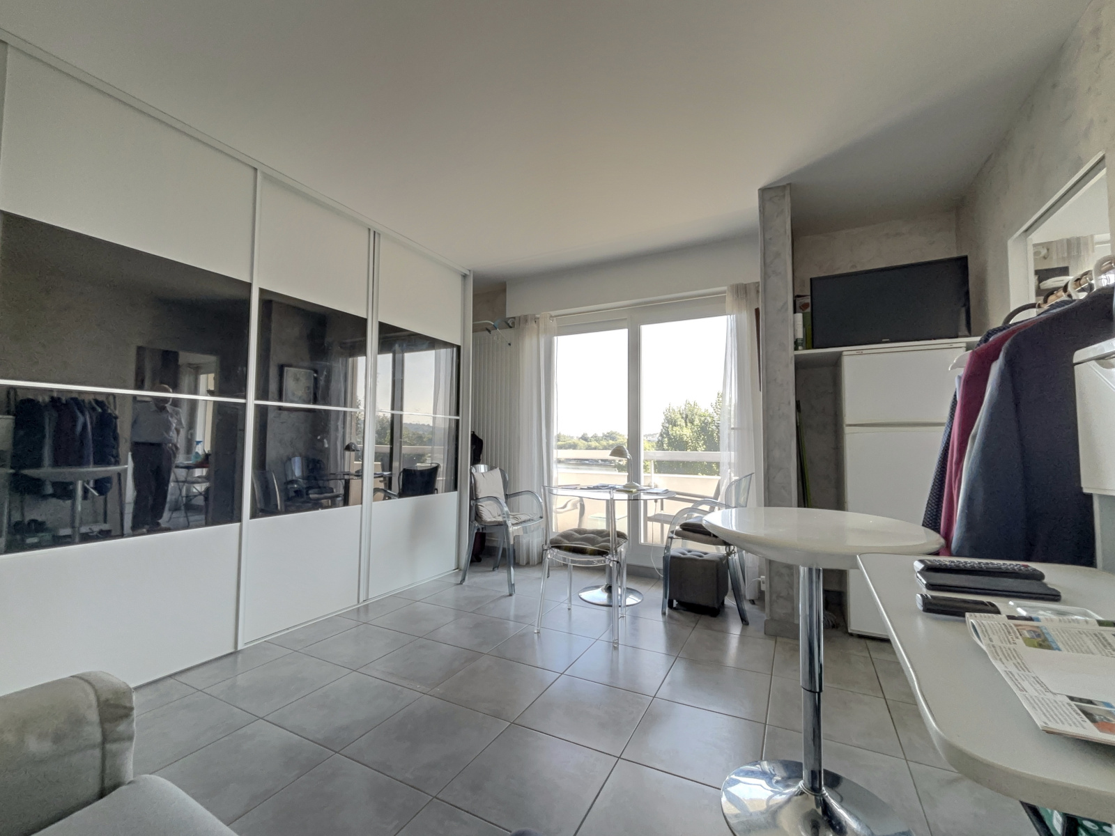 Il se compose d'une pièce de vie, une cusine équipée le tout donnant sur un grand balcon avec une vue dominante sur les parcs et les bords d'Allier, une salle de douche, un wc.