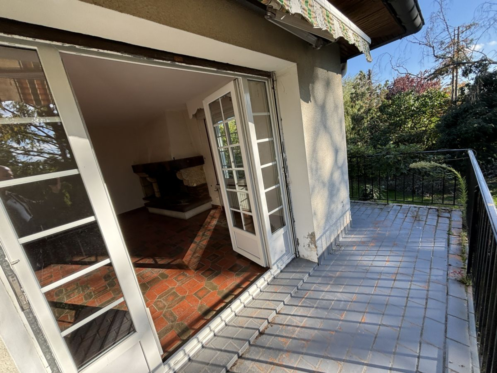 Un salon / salle à manger de 33m² avec une cheminée et balcon, une cuisine aménagée ouvrant sur une terrasse, 3 chambres, un bureau, une salle de bain, wc.