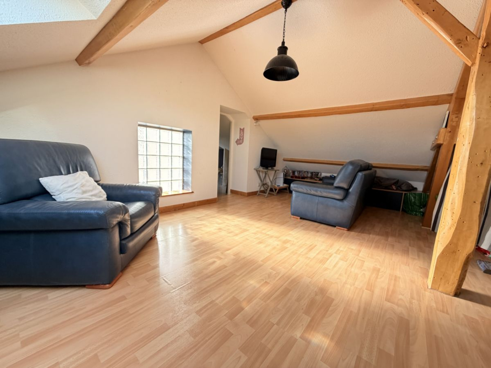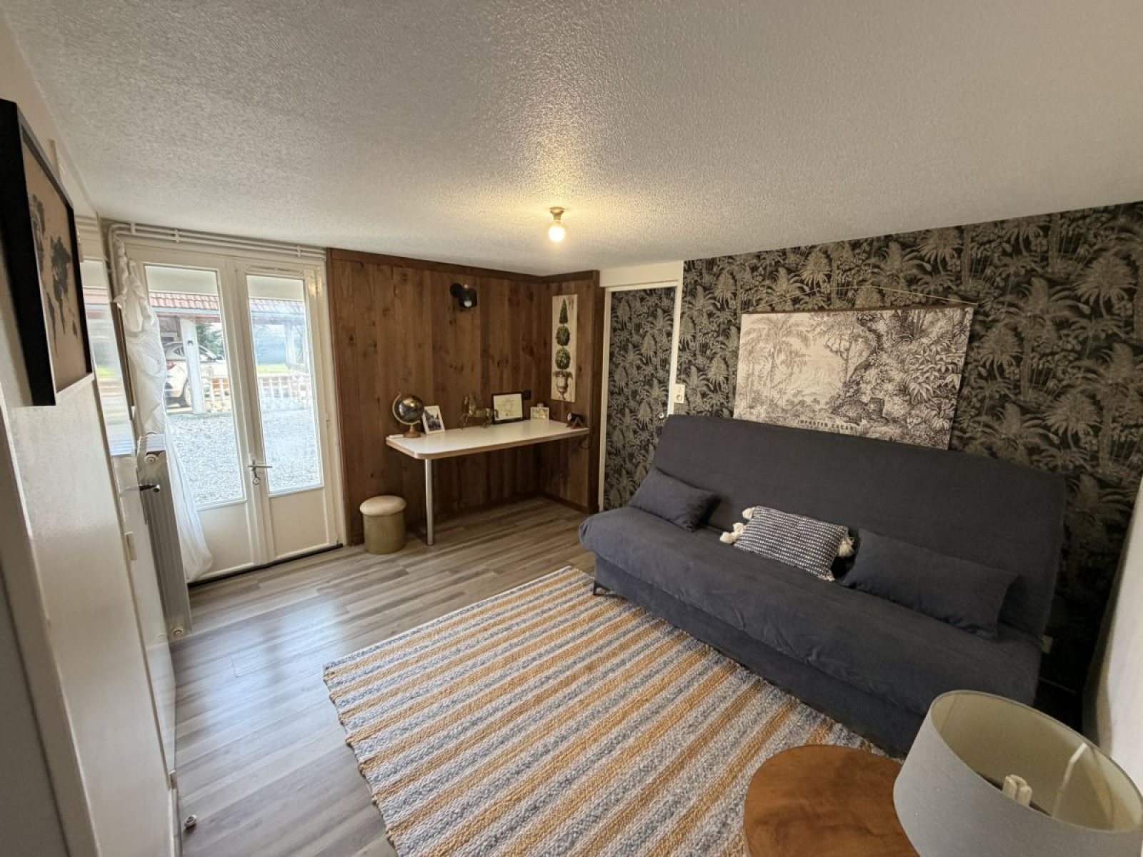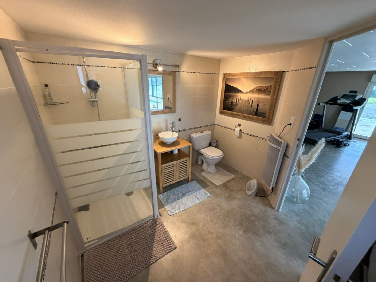 Ce bâtiment de 1965 a bénéficié d'une extension en 2010. Le bien se compose d'un rez-de-chaussée surélevé comprenant une entrée, une cuisine ouverte sur la salle à manger et sa cheminée, un spacieux salon de 40m² ouvrant sur une terrasse de 27m² jouissant d'une vue dégagée. Sur ce niveau de vie se trouve une chambre avec placard de 17.5 m², une seconde chambre / bureau 11.90m², une salle de douche, un wc.