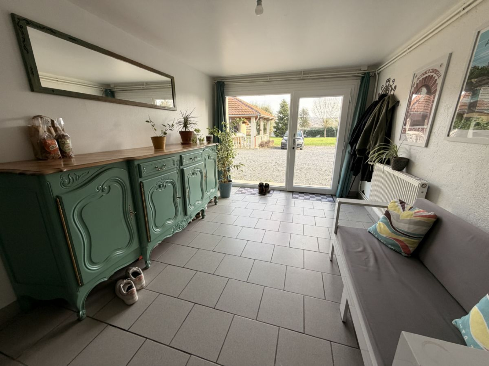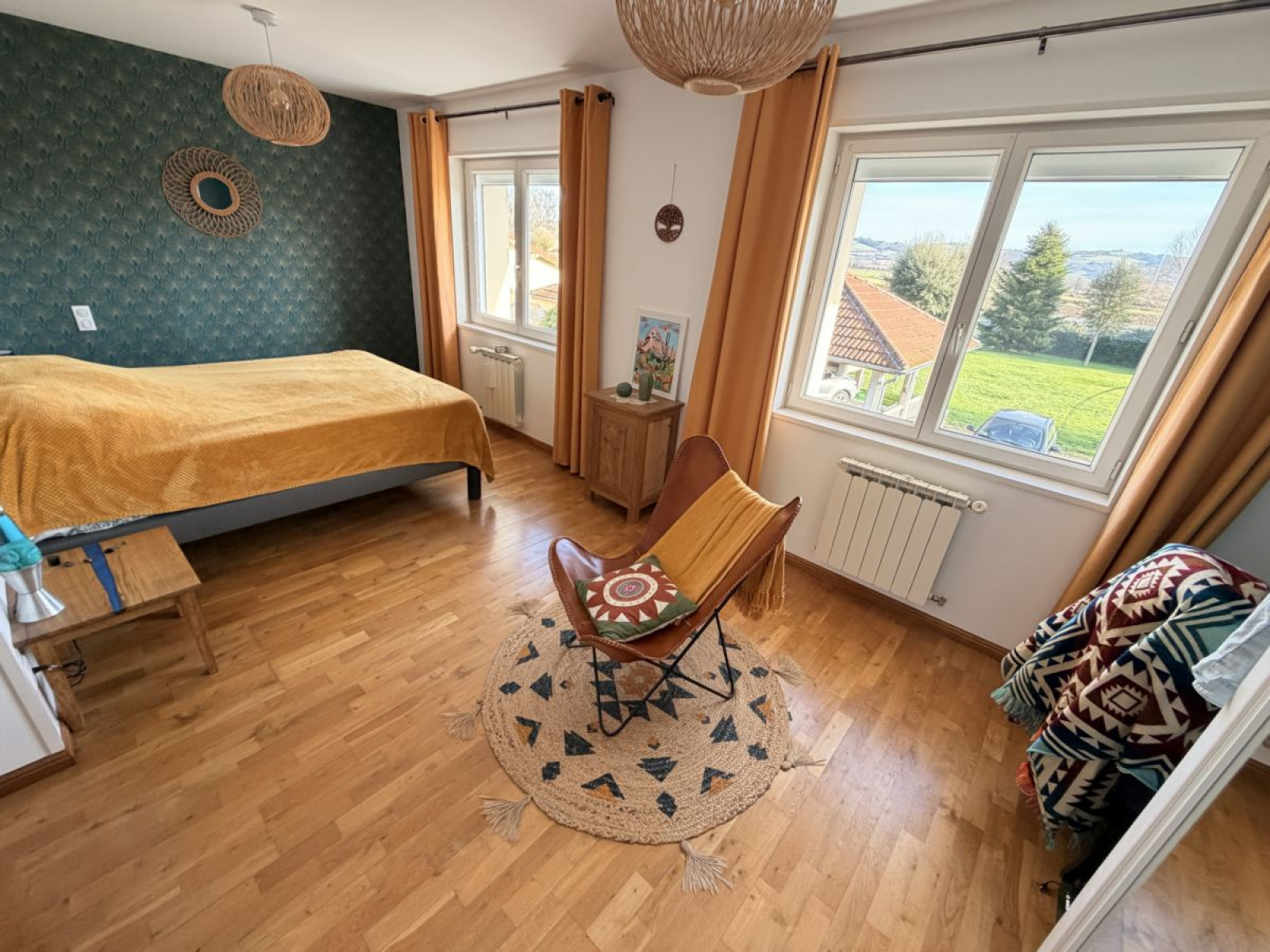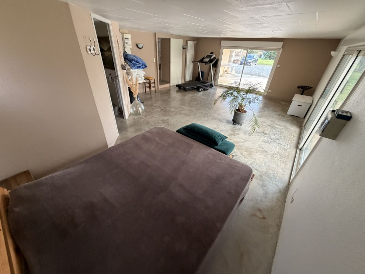 Ce bâtiment de 1965 a bénéficié d'une extension en 2010. Le bien se compose d'un rez-de-chaussée surélevé comprenant une entrée, une cuisine ouverte sur la salle à manger et sa cheminée, un spacieux salon de 40m² ouvrant sur une terrasse de 27m² jouissant d'une vue dégagée. Sur ce niveau de vie se trouve une chambre avec placard de 17.5 m², une seconde chambre / bureau 11.90m², une salle de douche, un wc.
