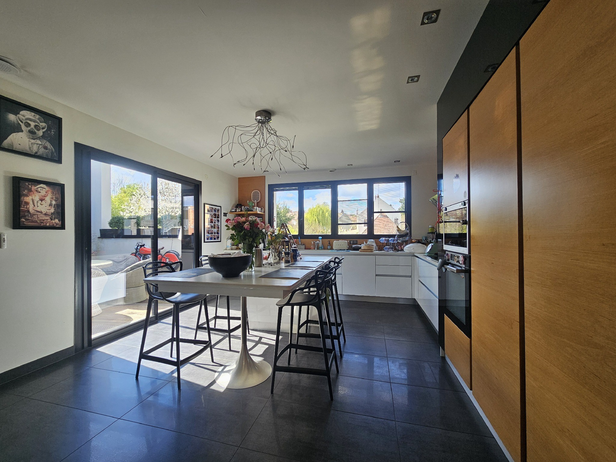 Plusieurs espaces de vie extérieurs de plain-pied, accessibles depuis le séjour et la cuisine, permettent de profiter pleinement du jardin orienté Est-Ouest, garantissant un ensoleillement optimal toute la journée.