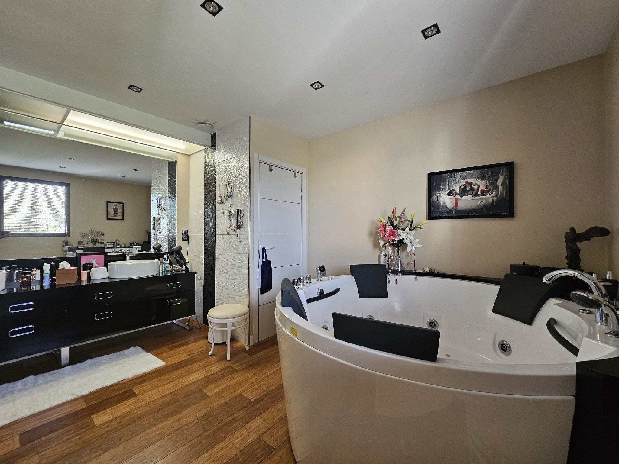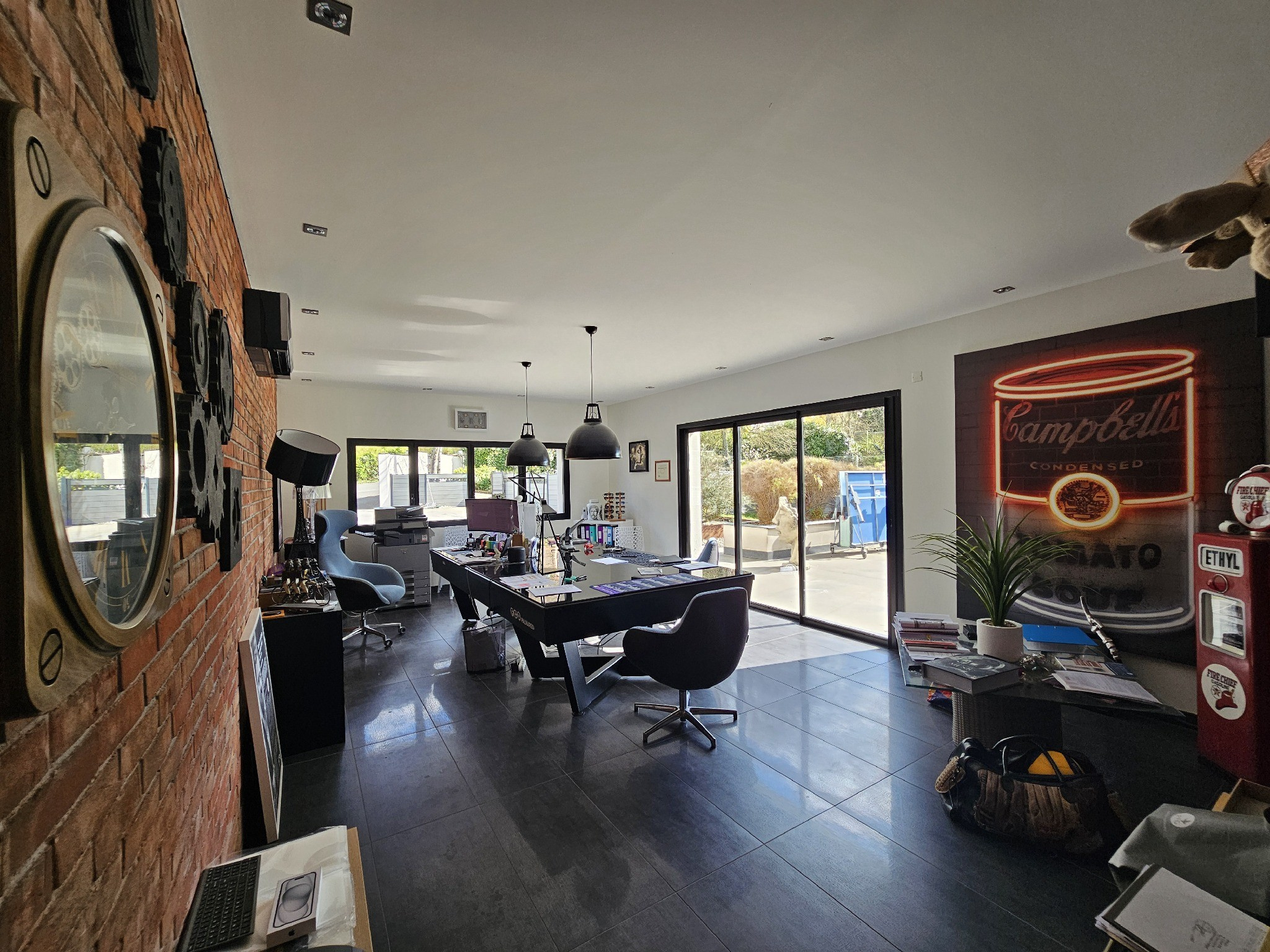 Au rez-de-chaussé,dès l’entrée, les volumes impressionnent avec une vaste pièce de vie de 95 m², baignée de lumière grâce à de larges ouvertures sur les terrasses et le jardin. Dans son prolongement, une pièce de jeux de 34,4 m² permet d’imaginer de multiples usages : espace détente, billard ou salon secondaire.